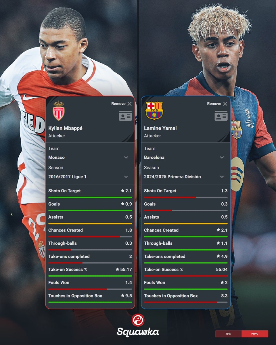 直播吧05月02日讯 Squawka对姆巴佩和亚马尔在各自17岁时的联赛场均数据进行了对比,两人互有胜负。其中,姆巴佩在射门终结方面占优,亚马尔则在机会创造和过人方面占优。
